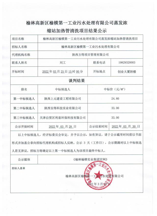 榆林高新區(qū)榆橫第一工業(yè)污水處理有限公司蒸發(fā)濃縮站加熱管清洗項(xiàng)目結(jié)果公示