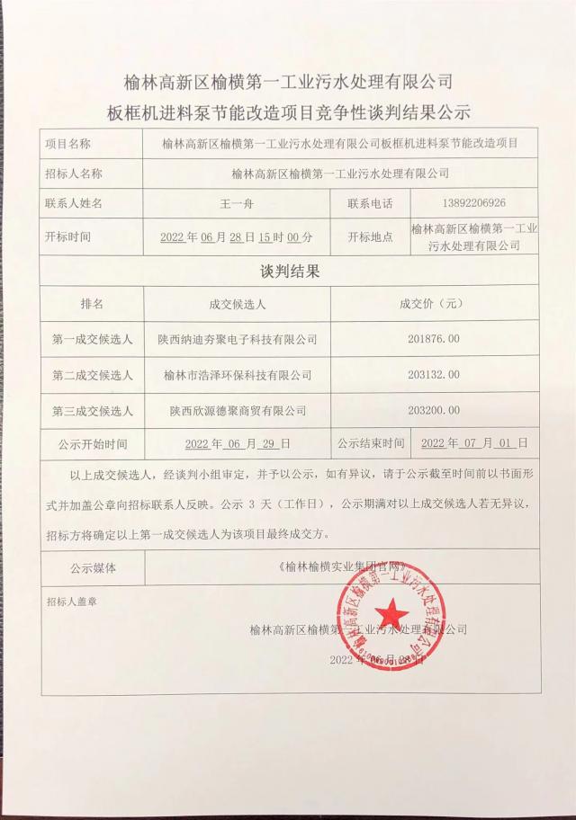 榆林高新區(qū)榆橫第一工業(yè)污水處理有限公司 板框機(jī)進(jìn)料泵節(jié)能改造項(xiàng)目競(jìng)爭(zhēng)性談判結(jié)果公示